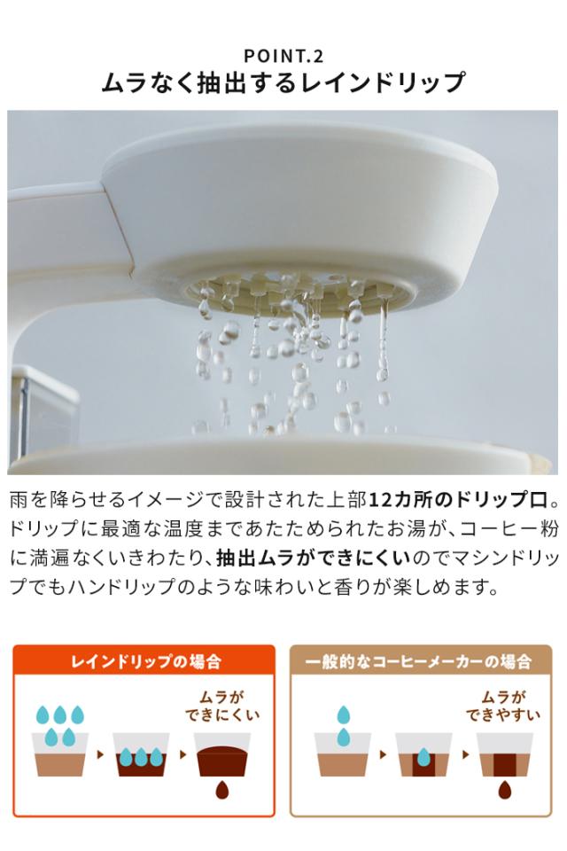 手軽なマシンドリップと、ハンドドリップの2WAYが楽しめるコーヒーメーカー。マシンドリップ時は水とコーヒー粉をセットしたらボタンを押すだけの簡単操作です。雨が降り注ぐようなドリップ口により、まんべんなくお湯を注ぐことで、抽出ムラがおきにくく美味しいコーヒーを淹れることができます。休日などゆっくり、自分好みのコーヒーにこだわりたいときはハンドドリップでも使用OK◎シーンや気分に合わせて使いわけができ、より豊かなコーヒータイムを堪能できます。 |