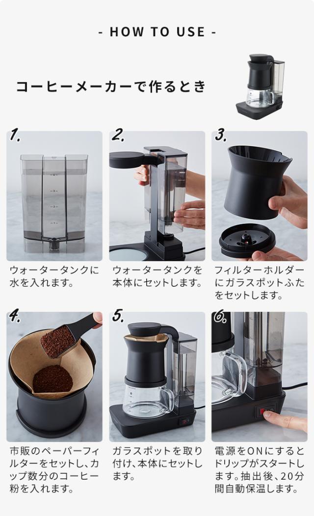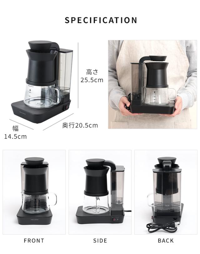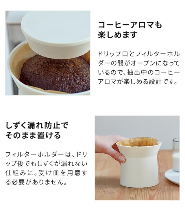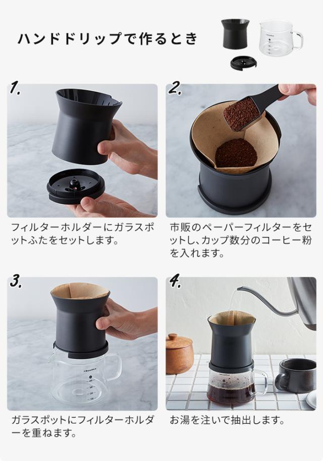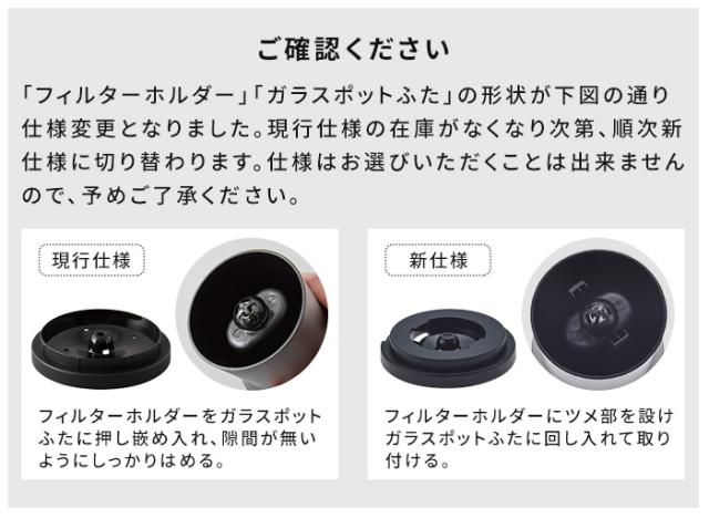 | 備考 | ・ペーパーフィルターは別売です。市販のペーパーフィルター「2〜4 カップ」用(サイズ:「1×2」または「102」)をご使用ください。 ・使いはじめのうちは、本体のプラスチック部分が熱で温められることにより、プラスチック特有のにおいがする場合があります。お使いになるうちに、においは少なくなりますが、気になる場合は1〜2回本体の内部洗浄(水だけで抽出)を繰り返してからお使いください。 ・ガラスポットを直火にかけたり、電子レンジで使用しないでください。 ・フィルターホルダーとガラスポットふたは必ずすき間がないようしっかりはめてご使用ください。 |
