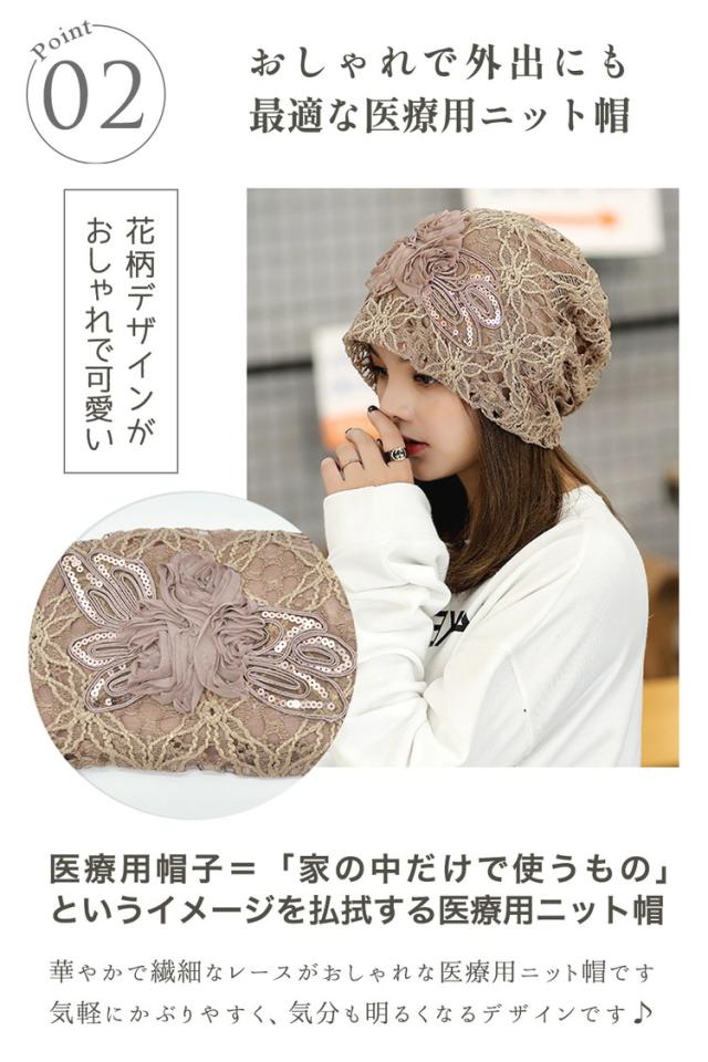 医療用でいながらフロントの花柄がおしゃれなレースニット帽です