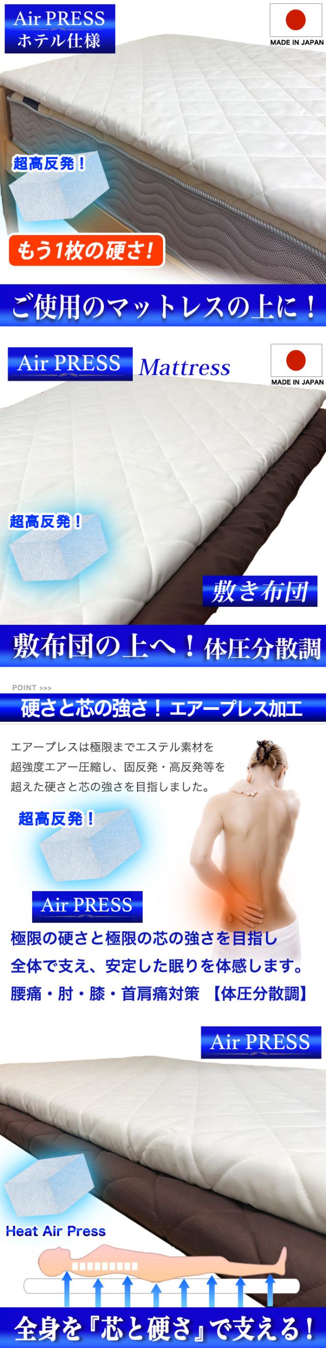 日本製 マットレス セミダブル Air Press Mat エアープレス マット 3層構造 弾力 強度加工 高反発 固反発 固め 硬め マット オーバーレイ 隙間 対策 抗菌 防臭 防カビ 速乾 防ダニ 吸汗 マットレス