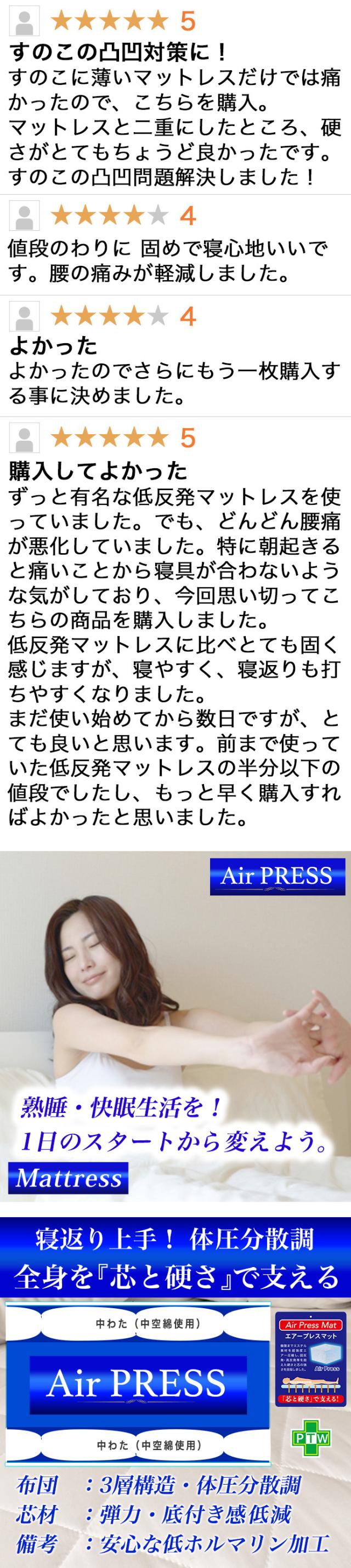 ◆ フロアリングや畳みにそのまま置いて! ◆ご使用の寝具の上にもう一枚の安定性をプラス! 【エアープレスマット】Air Press Mat 3層構造 高反発 固反発 固め 硬め 弾力 マット マットレス 安定性 寝返り上手 オーバーレイマットレス ヒートエアープレス加工:硬めマット ◆ヒートエアープレス加工は極限までエステル素材をエアー圧縮して強度なマットレスを完成しました。 超圧縮のマットは強い芯と硬さでへたりにくく長時間安定性を保ちます。 ◆日本国内工場にて一枚一枚手作りして発送しております。 日本製 工場から直送しています。 【オプション/カバー・シーツ】別発送 メール便 ◆高密度シーツ+2,980円 素材:綿混・綿20% ポリエステル80% 色柄おまかせになりますのでご了承願います。 ◆シルク調ワンタッチシーツ+1,280円 素材:ポリエステル100% セミダブル:120×210mm ※オプションのカバー・シーツについて。 別発送の日本郵便・ゆうパケット(メール便)にて 直接お客様のポストへ投函されます。発送からお届けまで通常2〜4日ほどお時間を頂きますのでご了承ください。遠方や配送の混雑期には、お届けまでに1週間前後かかる場合がございます。また、複数枚ご購入の場合は別便となることがございます。ご了承願います。 |
