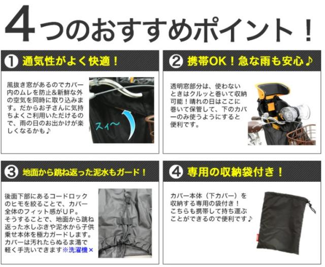 ヘッドレスト付き、ヘッドレストなし両方の前用子供乗せに対応した雨除けカバー