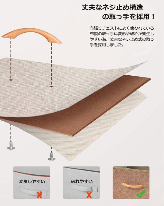 | おしゃれでシンプルな布張りチェスト。 衣類やバスタオル、雑誌やDVDなど引き出しに収納することでお部屋がスッキリ片付きます。 天板は木目のキレイなMDF化粧板を使用。 引き出しはファブリック製で中身が見えないので、とりあえずポイポイ大雑把に収納してもOK! 取り外して独立して使用することもできます。 脚部にはアジャスター付きでがたつきを防ぎます。 |