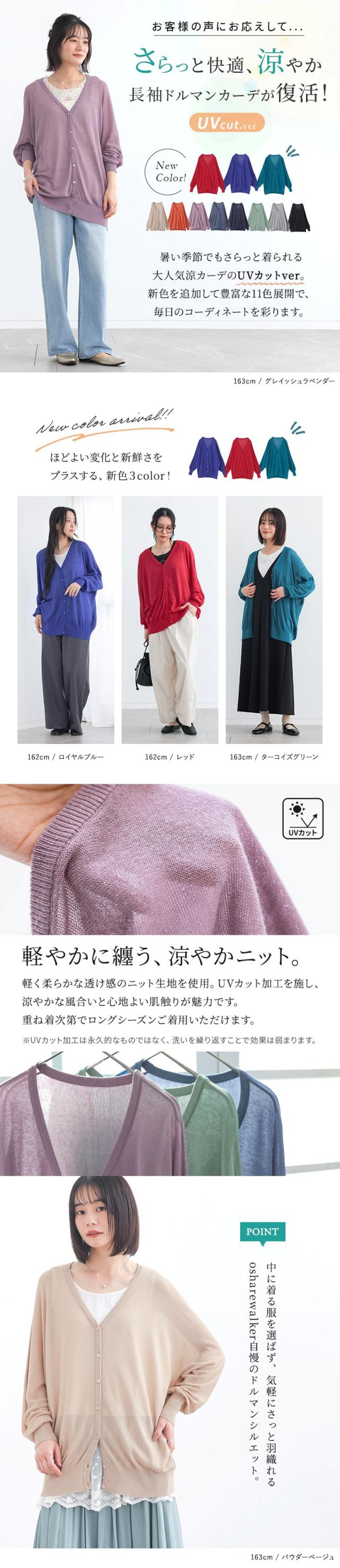 【新色登場】カーディガン レディース 春 夏 トップス 長袖 ニット サマーニット Vネック UVカット ドルマンシルエット 薄手 チュニック丈 紫外線対策 冷房対策 軽量 体型カバー 二の腕カバー オシャレウォーカー ※メール便可※【10】