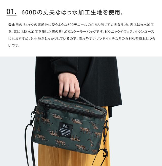 登山用のリュックの底部分に使うような600デニールのかなり強くて丈夫な生地。表ははっ水加工を、裏には防水加工を施した雨の日もOKなクーラーバッグです。ピクニックやフェス、タウンユースにもおすすめ。外生地がしっかりしているので、潰れやすい食材も型崩れしづらいです。コンパクトですが、350ml缶がちょうど6缶入るサイズ感。中生地にはアルミ素材を使用。保冷剤をメッシュポケットに入れれば、さらに保冷効果が得られます。外側のフロント部にもポケットがあり便利です。ショルダーベルトを中に収納し、側面を折り畳んで、フタ部分に付いているベルトを後ろに回して留めればコンパクトになるので、使わないときは省スペースになります。