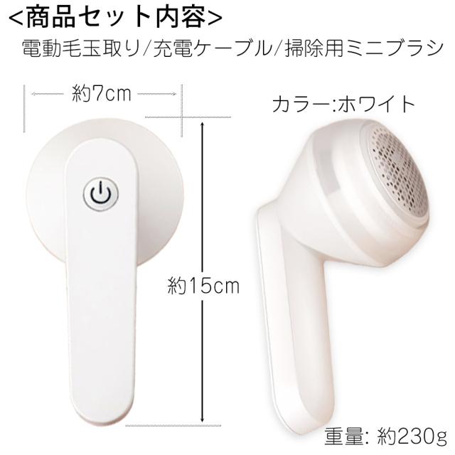 | 主な仕様 | ●商品内容(セット内容) ・電動毛玉取り ・USB充電ケーブル ・掃除用ミニブラシ ●商品サイズ(約): 幅7cm×高さ15cm ●商品重量: 約230g ※品質向上のため、本製品は予告なくデザインや仕様を変更する場合がございます。 ※海外製品のため、箱つぶれの場合がございます。何卒ご了承くださいませ。(中は問題ございません) |