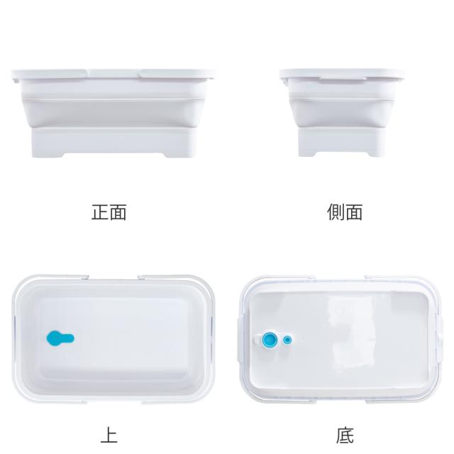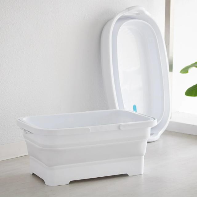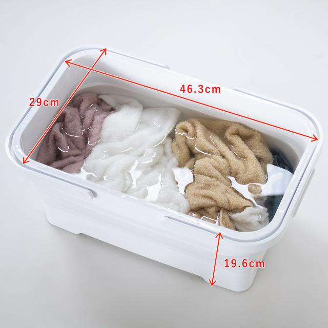 手洗いやつけ置き洗いに便利な折りたためるソフトタブです。使わないときは両サイドを押し込むだけで簡単にたためます。たたんだ際の厚さは約6.8cmとコンパクトなので、ちょっとした隙間があれば収納できます。