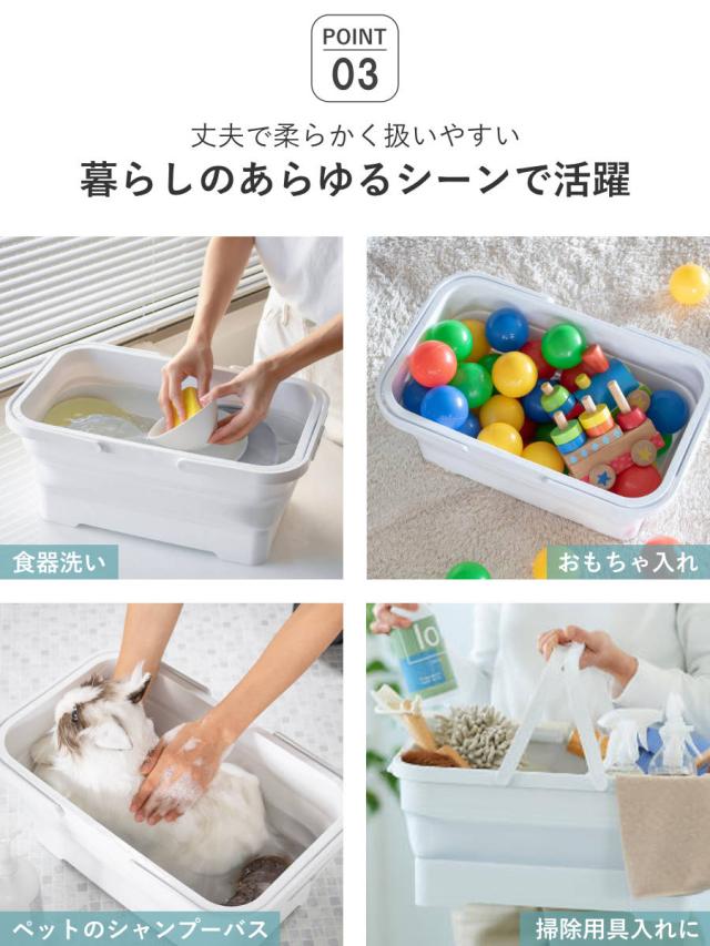 手洗いやつけ置き洗いはもちろん、暮らしのあらゆる場面で活躍します。食器洗い、おもちゃ入れ、ペットのシャンプーバス、掃除用具入れなど、使い方は自由自在。丈夫で柔らかい素材なので、お子様やペットにも優しく、扱いやすい万能アイテムです。
