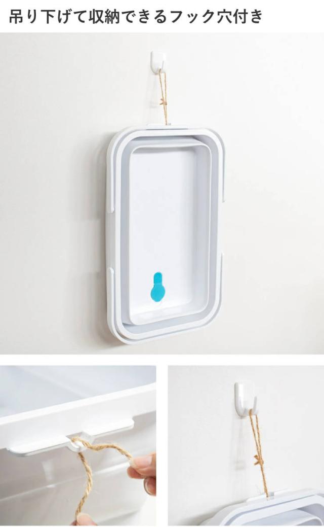 バケツにはフックを掛けられる穴が付いており、吊り下げてスッキリ収納できます。使いたいときにサッと手に取れる、便利な収納スタイルです。