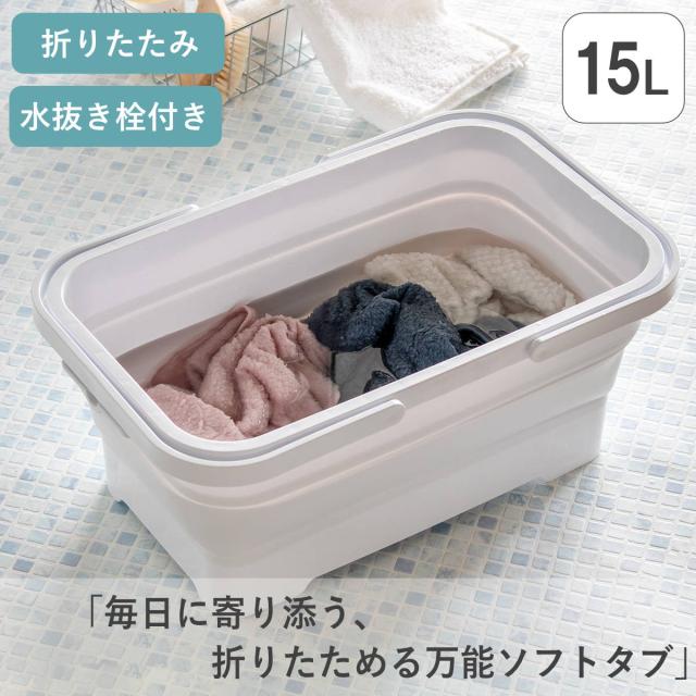 バケツ 折りたたみ 15L ソフトタブ ハンドル付き ( 折り畳みバケツ 大容量 角型 持ち手付 ソフト タブ 漬け置き洗い 桶 洗い桶 洗濯かご フットバス キッチン ランドリー たためる レジャー ペット 大きい ホワイト シンプル )