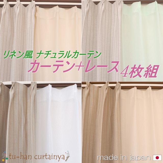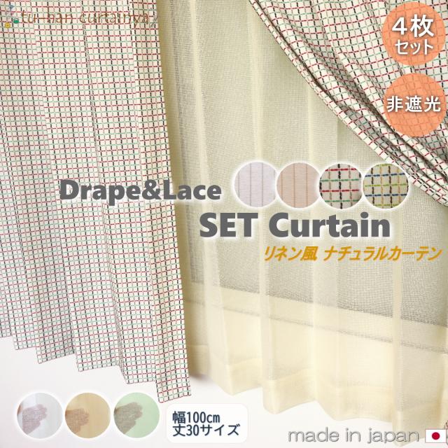 【カーテンセット】カーテン4枚セット 非遮光【リネ/ポワン+ハント】リネン風 ナチュラル レースカーテン 無地 ストライプ ざっくりレース リネン調 ガーゼ 幅100cmセット 綿 天然素材風 かわいい 自然派 光を感じる 日本製