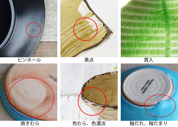 原料や製造方法により、上記のような特性がみられる場合があります。ひとつひとつのうつわの持つ個性、温かみある風合いとしてお楽しみいただければ幸いです。
