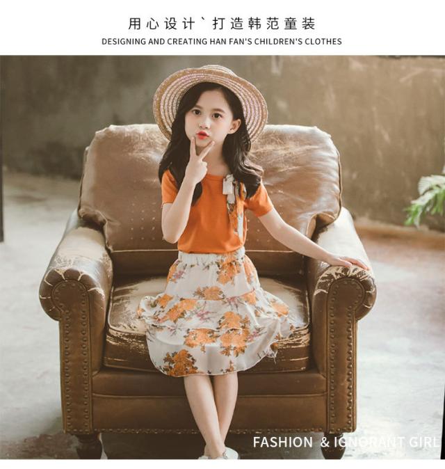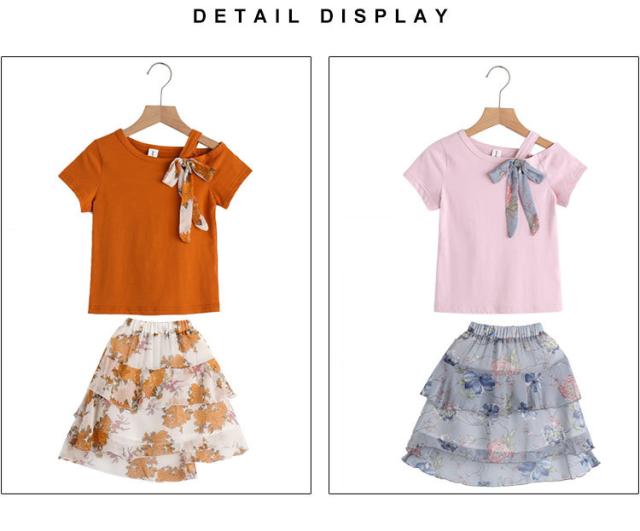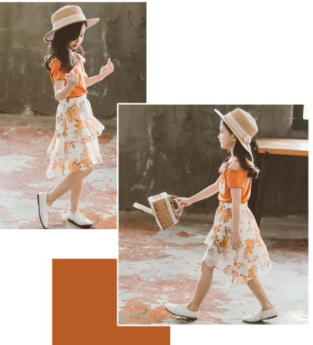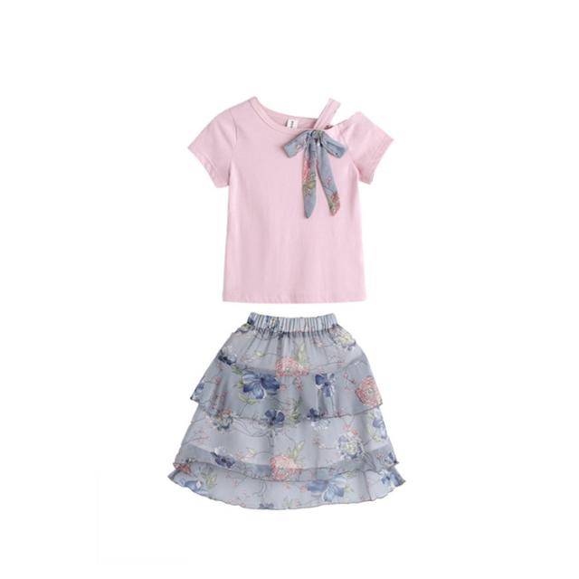 子供服 セットアップ 女の子 春夏 上下2点セット 半袖Tシャツ 肩出し リボン スカート 花柄 ジュニア おしゃれ 可愛い 新作