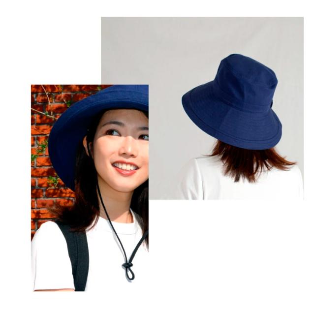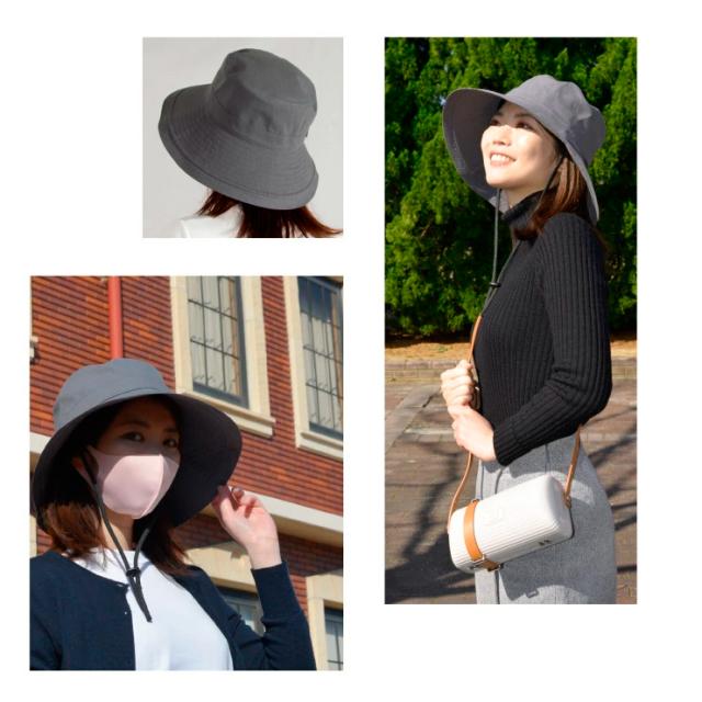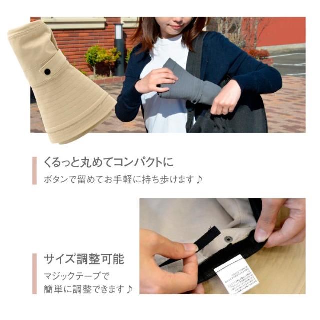 - 旅行用に購入しました。かさばらなくて、あごひものおかげで帽子も飛ばず、丸めた時にも止められて、とても便利です。