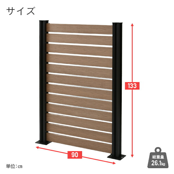 | 本体サイズ | ・完成時サイズ 幅90×奥行7×高さ133cm 重量26.1kg ・支柱サイズ(1本あたり) 幅7×奥行7×高さ133cm 重量7.05kg ・人工木1×4材サイズ(1本あたり) 幅80×奥行2×高さ9cm 重量1kg |