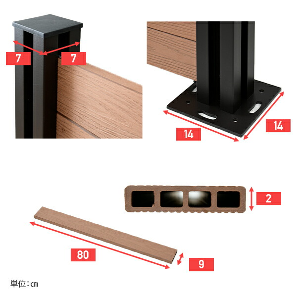 | 材質 | 支柱本体:金属(アルミニウム) ネジ類:ステンレス 支柱キャップ:ポリエチレン 人工木1×4材:木粉混合ポリエチレン |