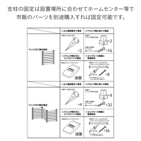 | 商品説明 | ●付属の人工木1×4材とアルミ支柱でDIYするガーデンフェンスのフェンス拡張セット ※本ページの製品は追加用の支柱1本+人工木材のセットです ※本製品だけではフェンスは作れません ●幅90cm、高さ187cmタイプ ●フェンスデザイン:ボーダータイプ ●人工木材のカラーは2色(ブラウン、ナチュラル)よりお選びください ●おうちの地面との設置もホームセンター等で市販のパーツを別途購入すれば固定可能です ※土に直接埋めて固定する場合、ブロック塀に挟んで固定する場合、ブロック塀の穴にコンクリートで固定する場合、コンクリートの地面に直接固定する場合など ●支柱はアルミ製なのでサビに強く丈夫 ●もしもフェンス部のカラーを変更したい場合などでも支柱は固定したままで簡単に新しいフェンスに入れ替えることができます ●フェンス部は耐久性が高くローメンテナンスな人工木材(1×4材) ●軽量タイプ:中空仕様 ●まるで天然木のような質感、風合いを楽しめます ●木目柄とスリット模様のリバーシブル仕様 好みやおうちのテイストに合わせて選べます ※天然木材同様に若干の反りがある場合がございますが、フェンス設置上は問題ございません ※人工木の特性上、小さなひっかき傷や欠けが生じることもございます ※製造工程の都合上、ロットにより若干の色のバラつきがございます ※ご使用のパソコンやスマホの画面によっては見える色味が若干違う可能性がございます あらかじめご了承ください ●セット内容:マルチフェンス支柱(187cmタイプ)×1、支柱ベース×1、支柱キャップ×1、スペーサー×32、ブロック用固定パーツ×1、フェンス下部スペーサー(長)×2、ファンス下部スペーサー(短)×2、フェンス上部金具×2、支柱ベース用ネジ×4、スクリューネジ×10、人工木1×4材(80cmタイプ)×17 ●別売の同シリーズ「KMFS-1871+WPC1X4」「KMFS-PS」を買い足せば、フェンスの拡張が可能です ※支柱設置不備による事故等は、一切責任を負いかねます |
