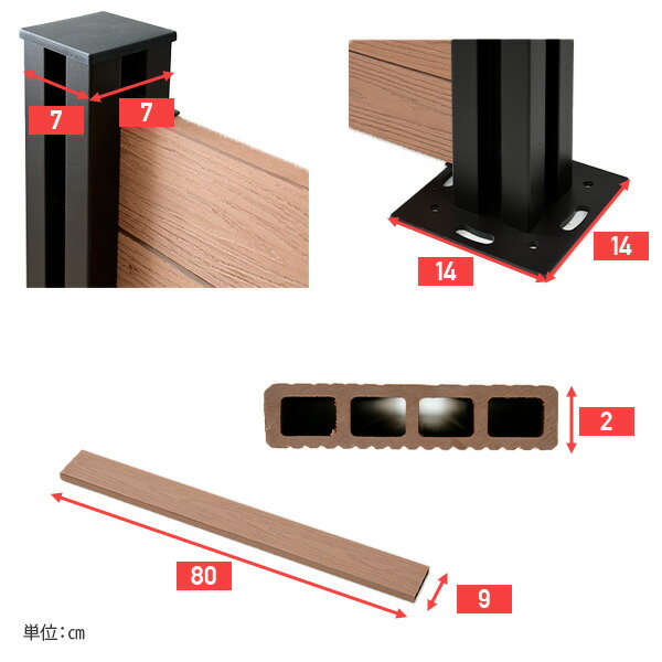| 材質 | 支柱本体:金属(アルミニウム) ネジ類:ステンレス 支柱キャップ:ポリエチレン 人工木1×4材:木粉混合ポリエチレン |