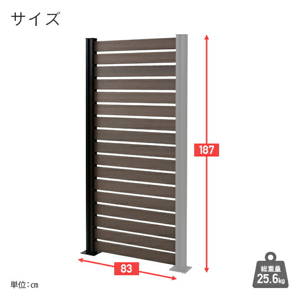 | 本体サイズ | ・完成時サイズ 幅83×奥行7×高さ187cm 重量25.6kg ・支柱サイズ(1本あたり) 幅7×奥行7×高さ187cm 重量8.6kg ・人工木1×4材サイズ(1本あたり) 幅80×奥行2×高さ9cm 重量1kg |