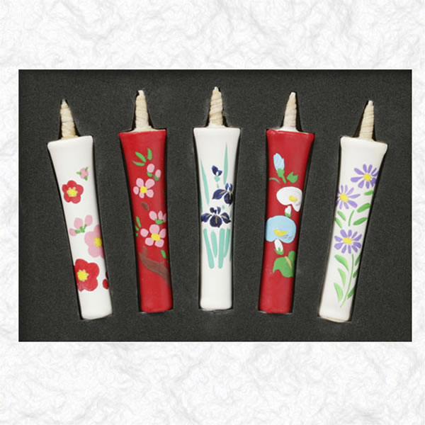 五節句に関連する花を五本の和ろうそくに絵師が一本ずつ手描きしています。