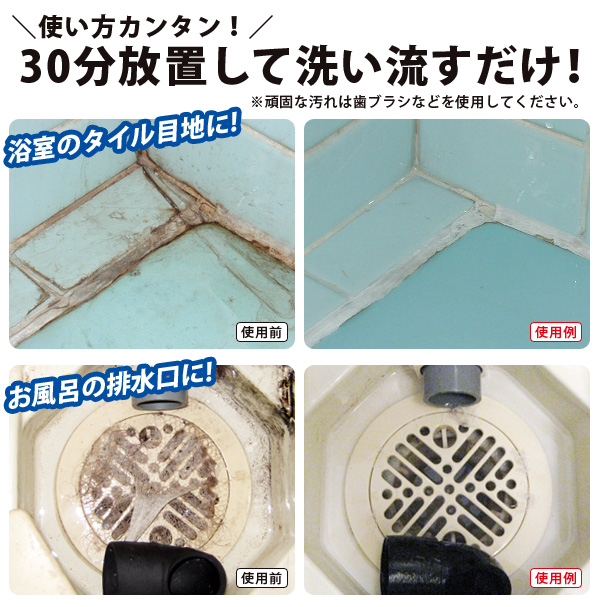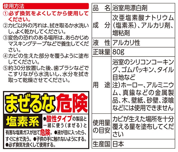 ●他の容器に移して使用しないでください。用途以外に使用しないでください。●直射日光を避け、子供の手の届かない冷暗所に置いてください。■正味量:80g■用途:浴室のシリコンコーキング、ゴムパッキン、タイル目地など注)ホーロー、アルミニウム、真鍮などの金属製品、木、壁紙、砂紙、漆喰、ガラス(鏡)などには使用できません。■使用量の目安:カビが生えた場所を十分覆える量を塗布してください■成分:次亜塩素酸ナトリウム(塩素系)、アルカリ剤、増粘剤■液性:アルカリ性■日本製