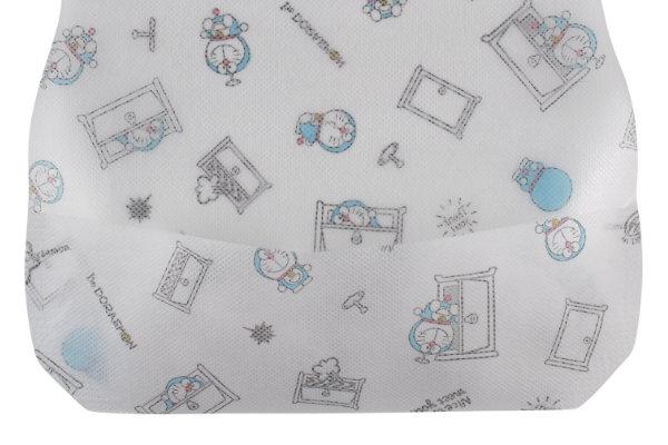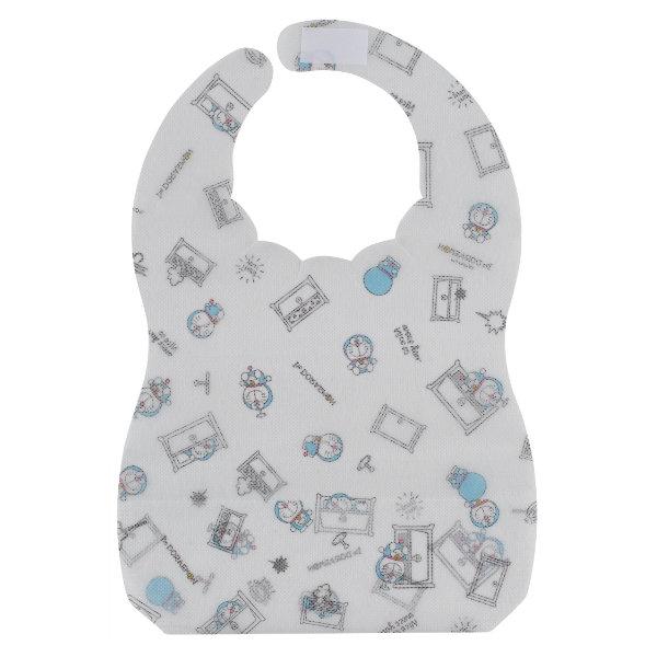 ドラえもんのイラストが描かれたベビーエプロンです。薄くてコンパクトに折りたためる使い切りタイプなのでお出かけにも便利です。