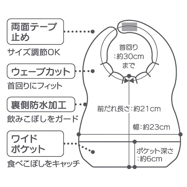 食べこぼしをキャッチワイドポケット付きなので食べこぼしをしっかりキャッチします。首回りは両面テープなので自由に調節できます。裏面は防水加工がほどこされているので飲みこぼしも安心です。