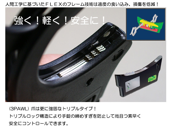 ASPのリジッド手錠は手錠をかけられる側の抵抗を減らす構造になっており横方向と直線移動性の両方が制御されます。 このような理由から、リジッド手錠は法廷や航空会社に理想的です。 手錠の接触面には円錐形の縁が丸みを帯びているので両手首の大小に関わらず手錠調整の範囲を増加します。 ロックアクションが非常に滑らかで Flexのフレーム技術は、過度の横応力による損傷の可能性を低減します。 薄くて軽量でコントロールしやすいのがリジッド手錠の特徴です。
