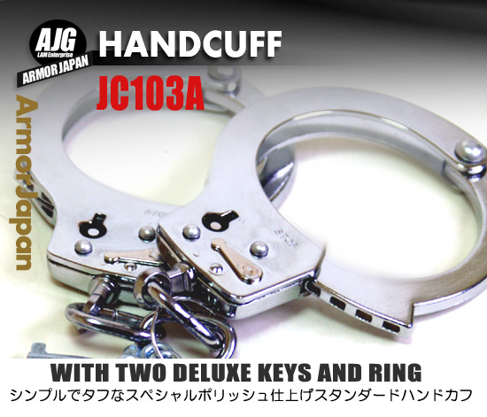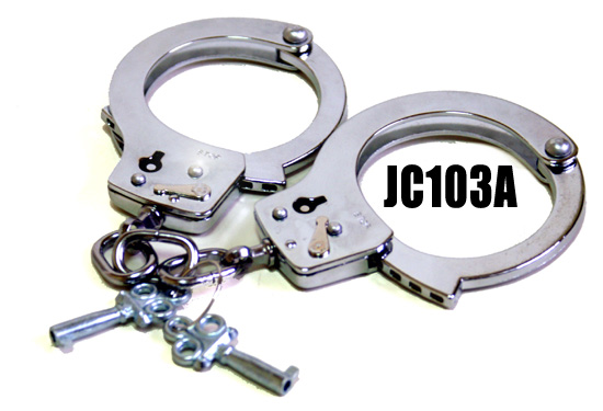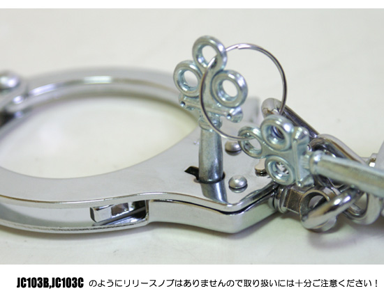 JCシリーズの型番を持つ手錠は台湾製ですが世界で4番目の生産量を持つマスプロダクションメーカーとして有名です。 お芝居やマジックにお勧めです。JC-103B/JC103Cのようにセルフリリースノブはついていまませんので鍵を使用して 開錠します。