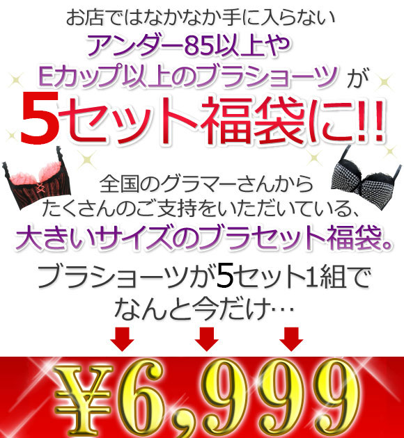 | 全国のグラマーさん必見!何が届くかお楽しみ♪ブラジャー&ショーツセットが5組入り!! 「大きいサイズのブラ5点入り福袋」が登場!!お店ではなかなか手に入らない【アンダー85以上】や【Eカップ以上】のブラショーツが5セット福袋に! |
