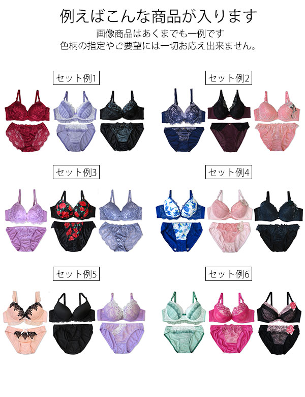 お店ではなかなか手に入らない【アンダー85以上】や【Eカップ以上】のブラショーツが5セット福袋に!"※メーカー採寸により、実際のサイズ、デザイン、色合いとは異なる場合がございます。