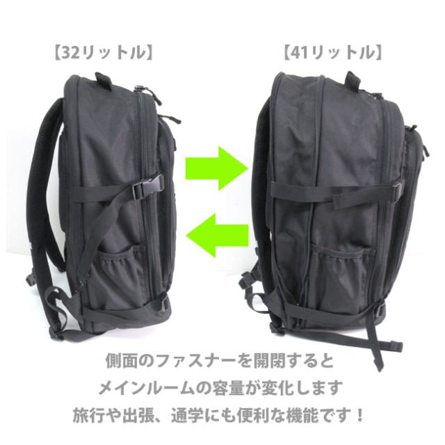 マチの幅がファスナーで変えられるマチ拡張タイプ。32L〜41Lまで対応するので通学や旅行はもちろん、普段のお買い物にも便利。