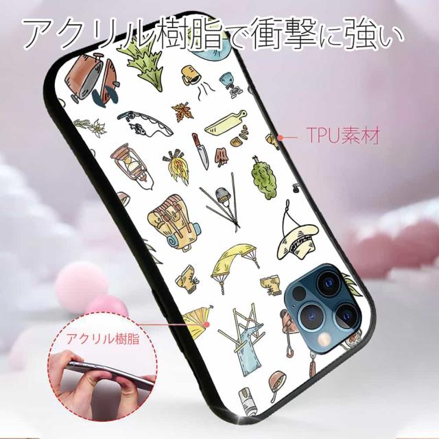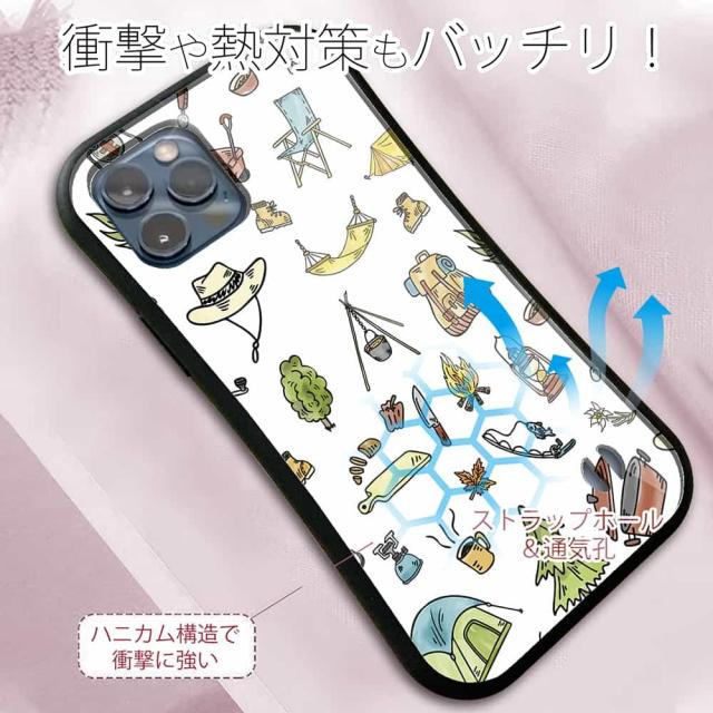 | 商品説明 | 落下や衝撃に強いTPUケース+綺麗に印刷できるアクリル板でプリント。キャンプで使う道具やテントをデザインしたケース。思わずキャンプに行きたくなる。 |