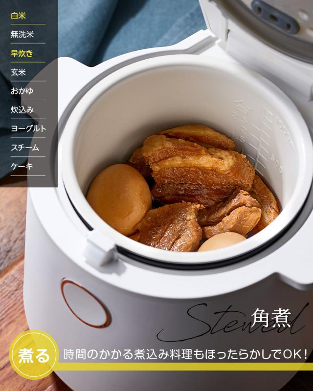 - デザインと色が気に入って購入しました。二合炊きで、コンパクトなのに機能は問題なく使えます。届くのもとても早くで助かりました。
