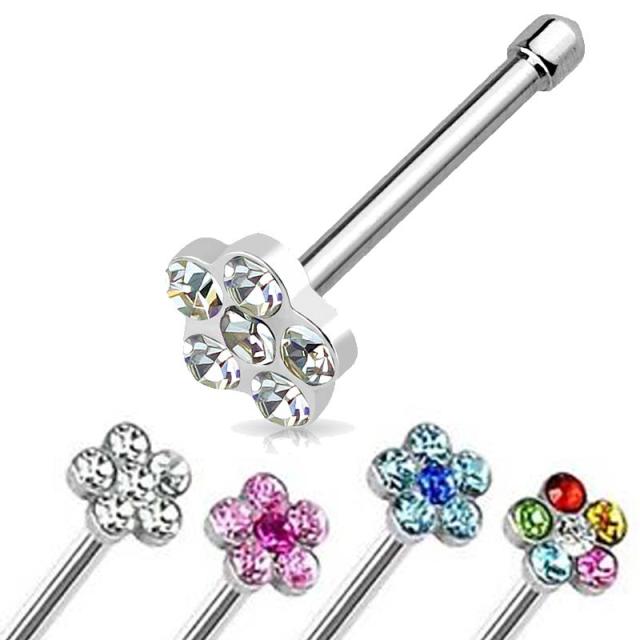 クリスタル、ピンク、アクアブルー、ミックスカラーの6つのキュービックジルコニアでお花をデザインした綺麗なサージカルステンレス製の鼻ピアスです。