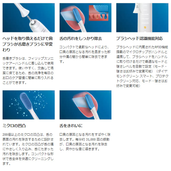 フィリップス ソニッケアーでクリーンな舌に ソニッケアーシリーズ唯一の舌磨きブラシ ■ブラシヘッド 舌磨き(ホワイト)2 本 ■ブラシヘッドの方式 はめ込み式 ■使用できるモデル ソニッケアーキッズ、e シリーズ以外すべてのモデル ■ブラシヘッド認識機能対応 ○ ■色 ホワイト ※記載は商品仕様の一部です。仕様説明不足等の理由での返品はできません。特に適合等は必ずご確認ください。