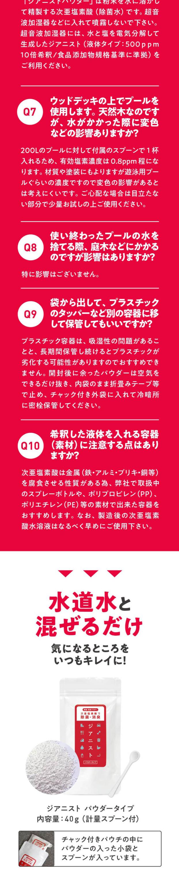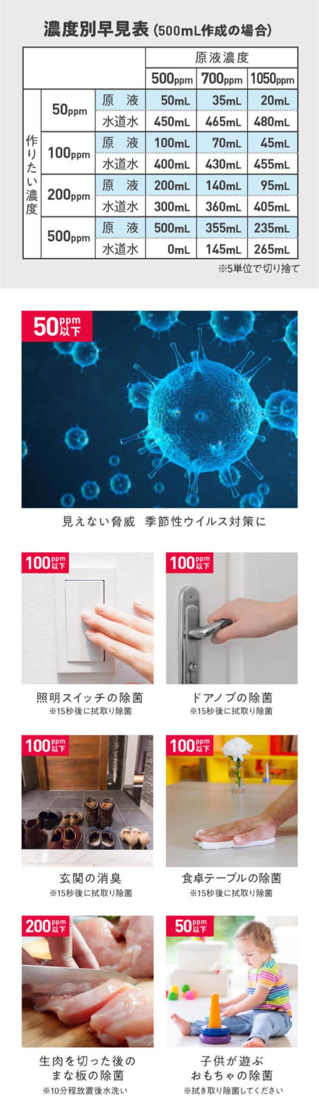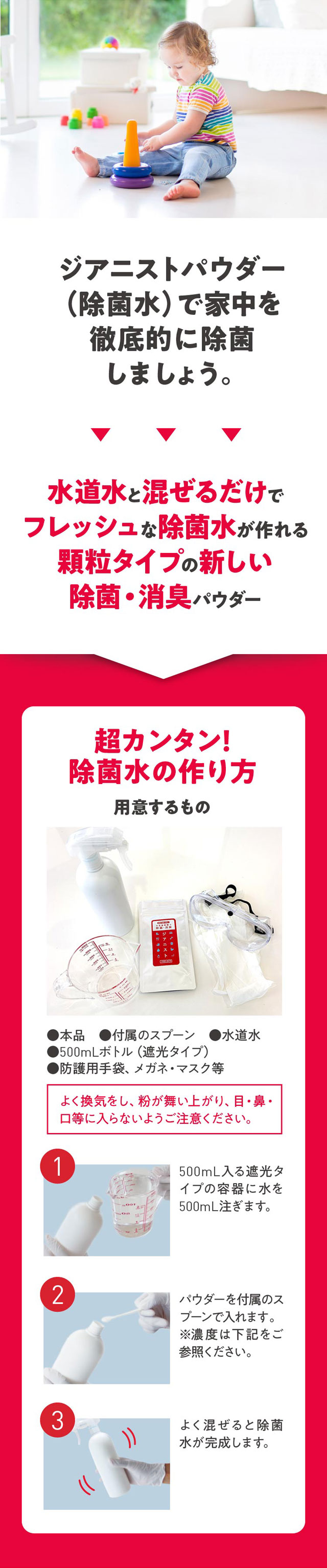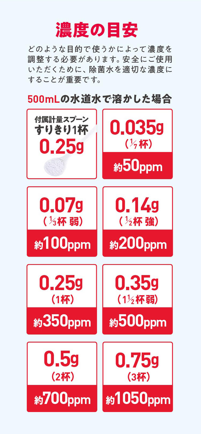 | ご使用方法 | 付属のスプーンを使い「ジアニストパウダータイプ」をすりきり2杯(0.5g)を入れます。 1杯がちょうど0.25gです。次に水道水500mLを加え、よく振って混ぜます。これが次亜塩素酸の原液(濃度約700ppm)になります。作った原液は用途に合わせて水でうすめて使用してください。どのような目的で使うかによって濃度を調整する必要があります。安全にご使用頂くためには、除菌水を適切な濃度にすることが何よりも重要です。※子ども用プールの除菌に使う場合 0.4〜1ppmの濃度がよいので、200Lのプール水に対しては「すきりきり1杯(0.25g)約0.875ppm)にするのが目安で24時間ほどもちます。※超音波加湿器などに入れて噴霧しないで下さい。 |