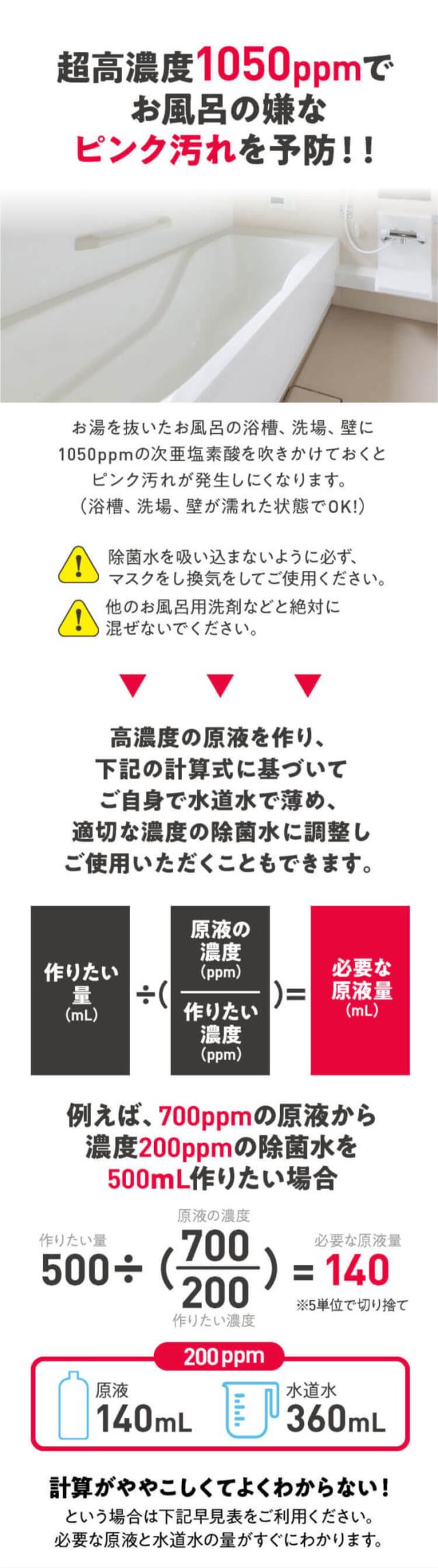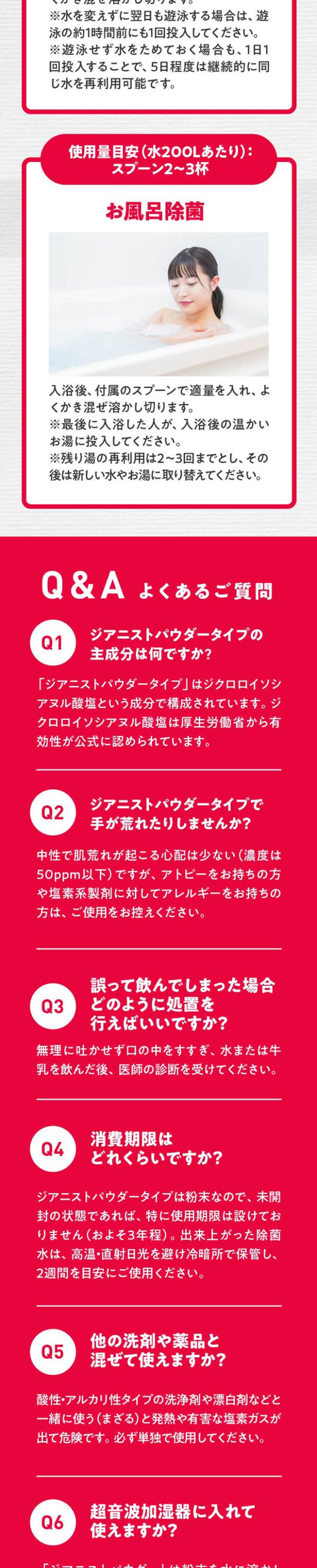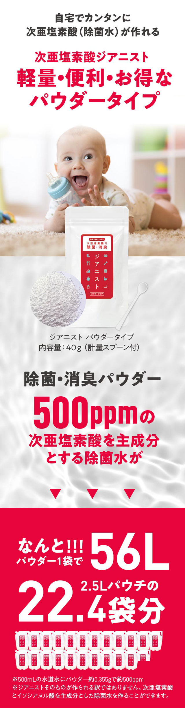 | ご使用方法 | 付属のスプーンを使い「ジアニストパウダータイプ」をすりきり2杯(0.5g)を入れます。 1杯がちょうど0.25gです。次に水道水500mLを加え、よく振って混ぜます。これが次亜塩素酸の原液(濃度約700ppm)になります。作った原液は用途に合わせて水でうすめて使用してください。どのような目的で使うかによって濃度を調整する必要があります。安全にご使用頂くためには、除菌水を適切な濃度にすることが何よりも重要です。※子ども用プールの除菌に使う場合 0.4〜1ppmの濃度がよいので、200Lのプール水に対しては「すきりきり1杯(0.25g)約0.875ppm)にするのが目安で24時間ほどもちます。※超音波加湿器などに入れて噴霧しないで下さい。 |