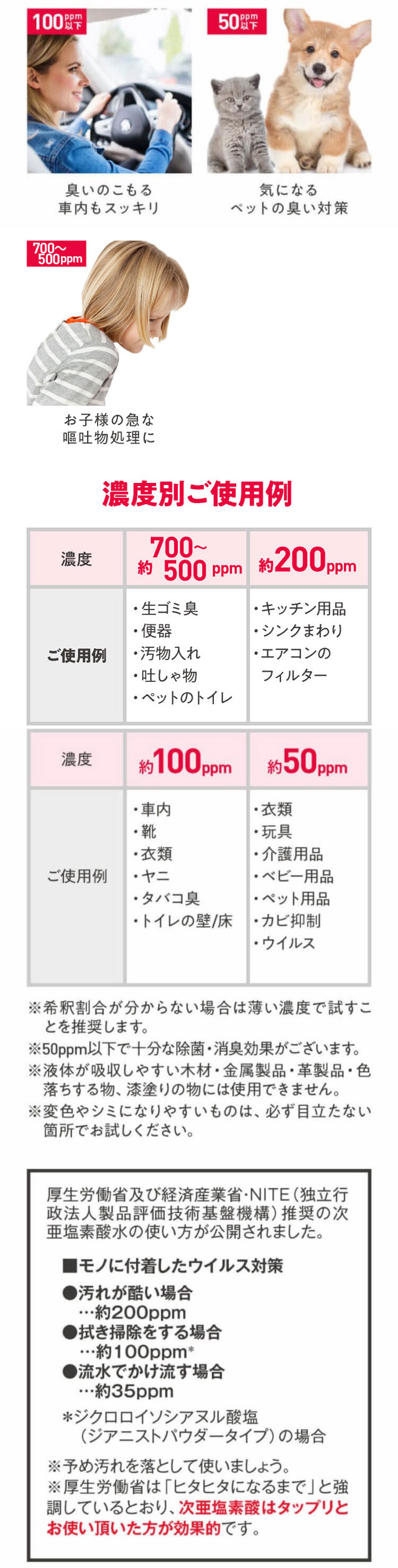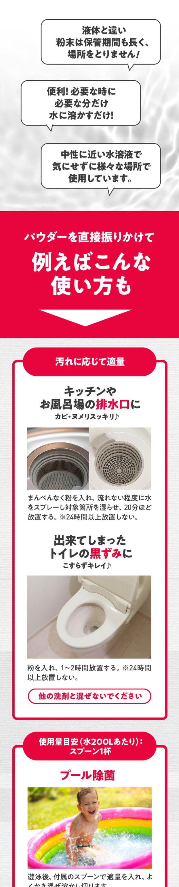 | ご使用上の注意 | 必ず使用前に使い方と使用上の注意をよくお読みください。●除菌水を作るときは炊事用手袋をつけてよく換気をし、粉が舞い上がり、目・鼻・口等に入らないようご注意ください。●体調がすぐれない方は使わないでください。●窓や戸を開ける、換気扇を回す等必ず換気する。(2カ所以上開けると換気効果が高い)●必ず単独で使用する。絶対に他の製品と一緒に使わない。●開封後は密封して保管し、できるだけ早く使用する。●用途外に使わない。●子供の手の届くところにおかない。認知症の方などの誤食を防ぐため、置き場所に注意する。●本品の粉末に、酸性タイプ、アルカリ性タイプの製品や食酢・アルコール等が混ざると有害なガスが発生して危険。●熱湯は使用しない。●アルミ・ホーロー・真ちゅう等の金属製品、衣類や敷物・木製品は、変色や脱色するので注意する。●高温、多湿や直射日光の当たる所に置かない。 |