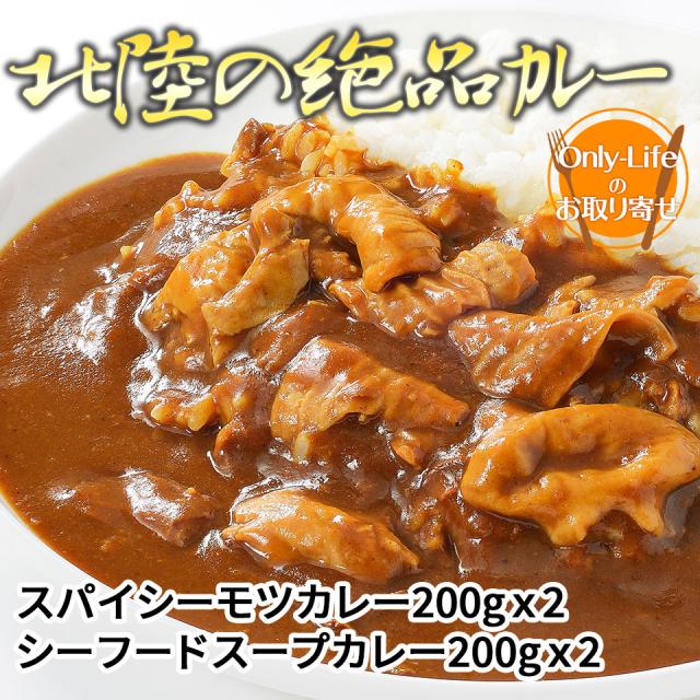 ヘルシー美味しい厳選した北陸の絶品カレー 各 2 食(計 4 食)スパイシーモツカレー シーフードスープカレー 200gx2 豚もつ 海老 濃厚 詰め合わせ 便利 ギフト 内祝い 紅白 贈り物 国内 プレゼント お歳暮 父の日 母の日 敬老の日 挨拶