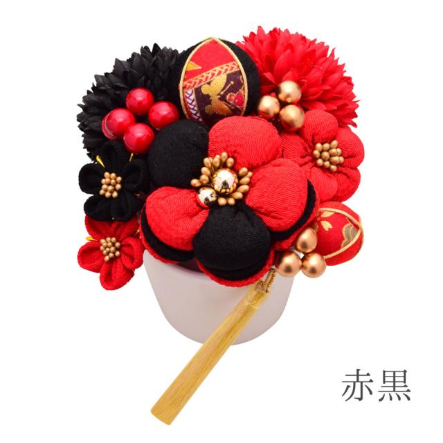 ころんとしたフォルムが愛らしいお花や存在感のあるちりめん玉などが、お顔周りをより華やかにしてくれます。