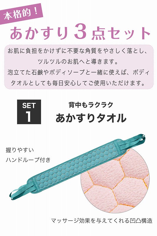 | 商品の説明 | 自宅で簡単あかすりエステ !古い角質を取り除きツルツル美肌へ ふわふわの泡立ちボール、背中もラクラクのタオル、 さっと手軽にできるミトンの3点セット 垢すりだけでなく、石鹸やボディソープを使うと、 摩擦効果が和らぎマイルドな洗い心地に。 毎日のボディケアとしてもご使用いただけます。 あかすりタオルやグローブは植物繊維を使用しているので、 お肌に負担をかけずに不要な角質をやさしく落とします。 マッサージ効果を与えてくれる凹凸構造で心地よく洗いあがりさっぱり♪ 湯船やフットバスなどで、古い角質を柔らかくしてから使用するとさらに効果的です 【使用方法】 ・お湯または水でよく濡らします。 ・気になる箇所を、やさしくマッサージするように擦ります。ミトンやタオルが乾いたら、その都度濡らしてください。 ・垢すりとしての使用は週1回ほどにし、徐々に頻度を調整して下さい ・使用後は手洗いし、浴室や日陰で干して下さい ・垢すり後は、ローションやクリームなどでしっかり保湿してください。 |