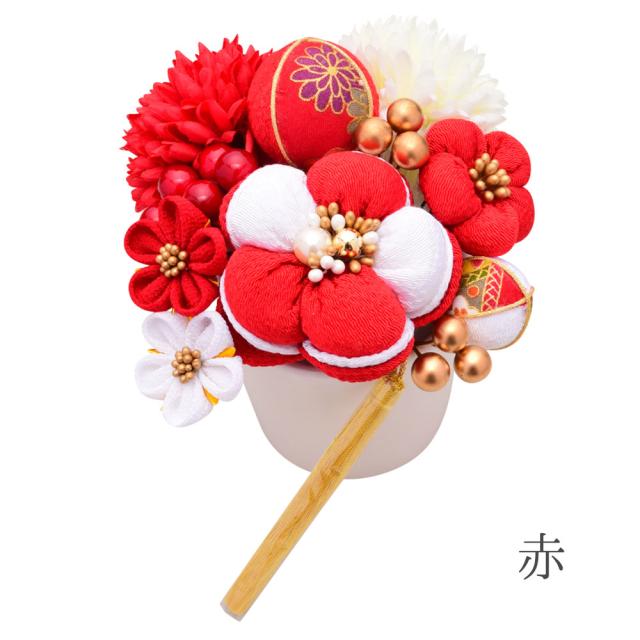 ころんとしたフォルムが愛らしいお花や存在感のあるちりめん玉などが、お顔周りをより華やかにしてくれます。