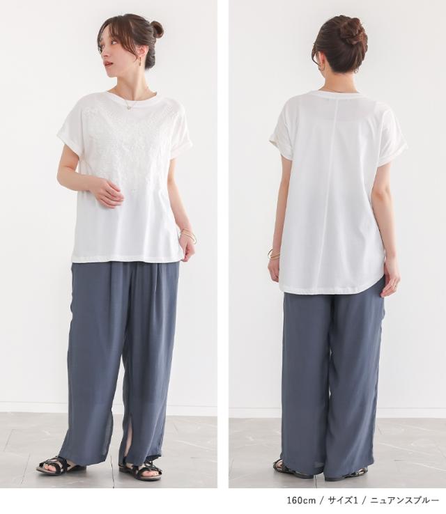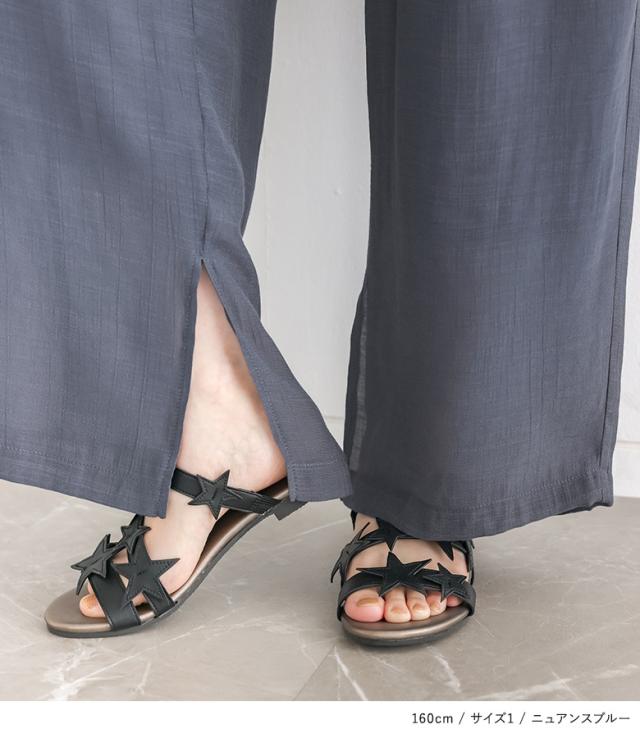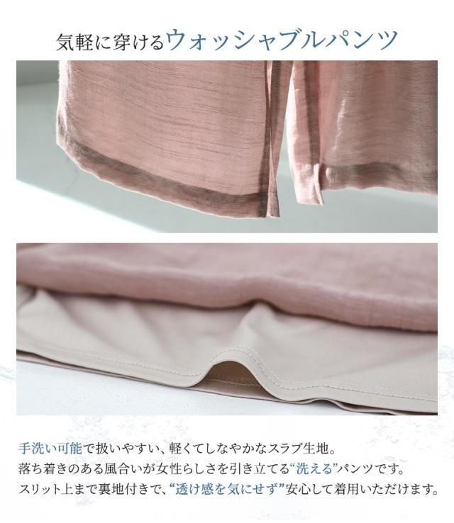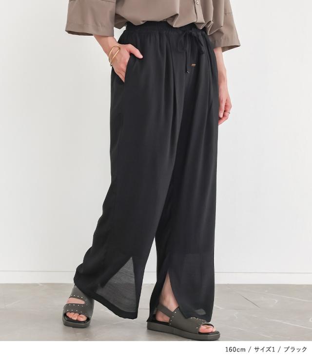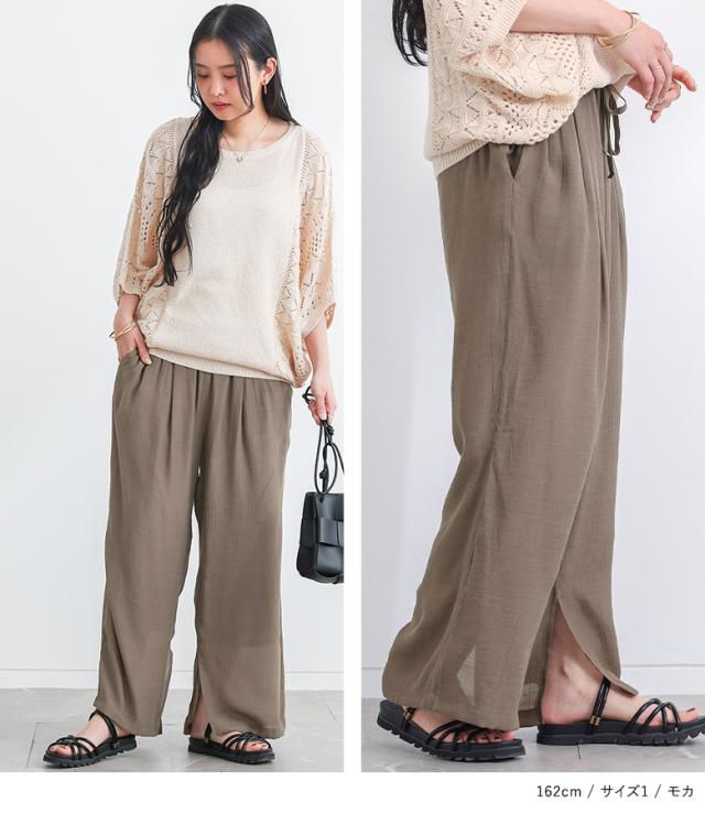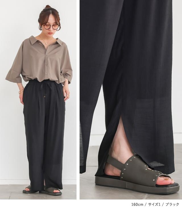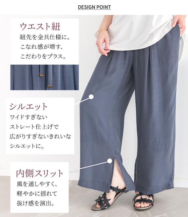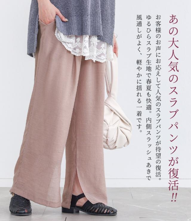 『ストレートワイドゆるひら涼スラブパンツ』 ※メール便可※【10】[ワイドパンツ レディース 春 夏 ボトムス ストレートパンツ ロング丈 イージーパンツ ウォッシャブル スリット スラブ生地 薄手 透け感 裏地付き 体型カバー]