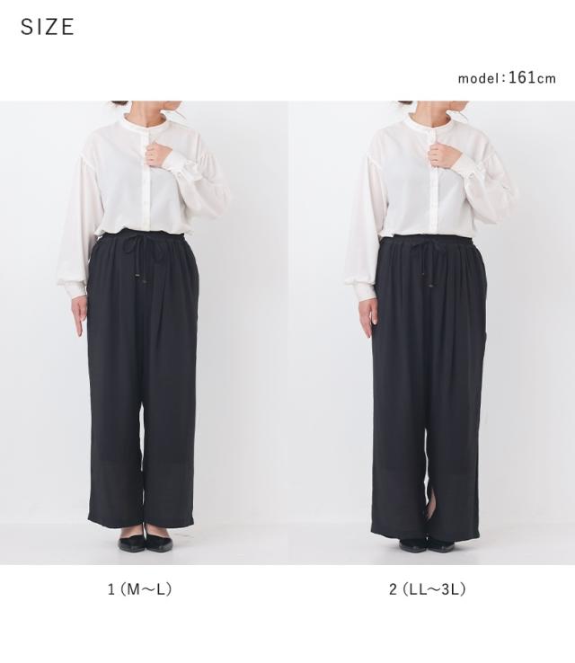 | 「ぽっちゃりさん」 163cm/65kg B104 W87 H105 普段はL またはLLサイズ着用。 | 【2(LL〜3L)】 ◆着丈:ウエストで穿いてくるぶしが隠れる位、腰で穿いてかかと上3cm位 1(M〜L)は太ももでつっかえてしまい、穿けませんでした。2(LL〜3L)は程よいゆとりをもって、ふんわりと楽に穿けました。身長が低めの方はヒールと合わせるのがおススメです♪ |