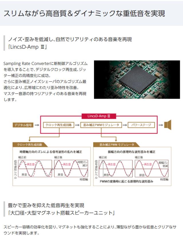 ノイズ・歪みを低減し、自然でリアリティのある音楽を再現する「LincsD-Amp III」や、豊かで歪みを抑えた低音再生を実現する「大口径・大型マグネット搭載スピーカーユニット」などにより、薄型ながら豊かな低音とクリアなサウンドを実現します。
