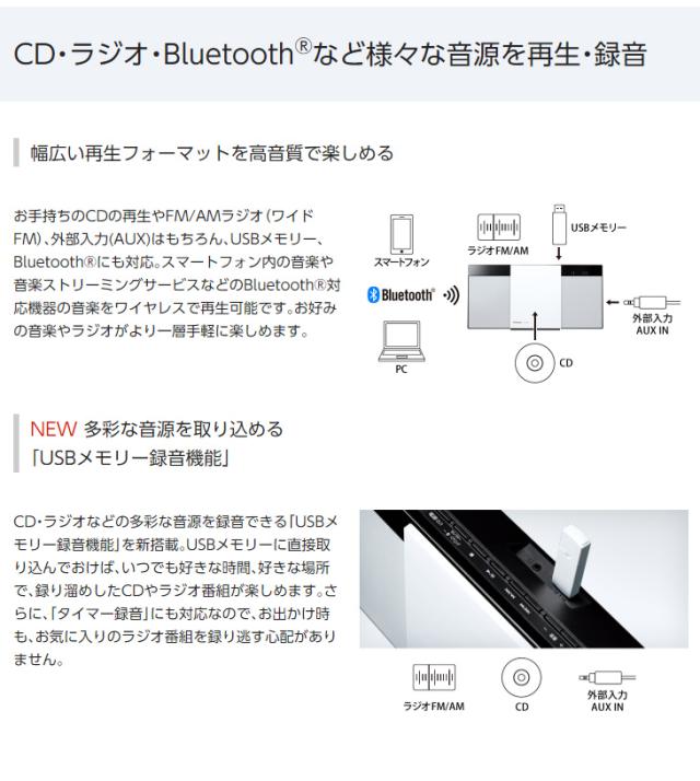 お手持ちのCDの再生やFM/AMラジオ(ワイドFM)、外部入力(AUX)、USBメモリー、Bluetooth®にも対応。スマートフォン内の音楽や音楽ストリーミングサービスなどのBluetooth®対応機器の音楽をワイヤレスで再生可能です。