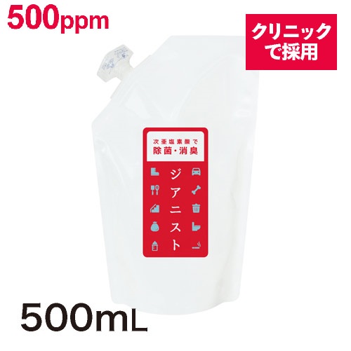 高濃度500ppm ジアニスト 500ml 1袋製造時は高濃度500ppm強 pH5.8の為、希釈して大容量の次亜塩素酸水としてお使い頂けます。次亜塩素酸水はアルコール耐性のあるウイルスや菌にも強く機能しますが、有機物に触れると水と約0.02%の塩に戻るため、ヒトや自然にも大変優しい除菌水です。専用超音波加湿器(噴霧器)を利用すると室内付着菌の除菌が可能です。※99.9%除菌性能テスト済み。超音波加湿器は「人の手を介さずに付着菌を処理するという発想から生まれました」※ジアニストを10倍に希釈(約50ppm)において、ウイルス・細菌・花粉・カビ・皮膚刺激性試験・急性経口毒性試験、急性吸入毒性試験、眼刺激性試験、微酸性次亜塩素酸水の食品添加物規格基準試験を第三者機関(北里環境科学センター、食品分析センター等)にて確認済み※無隔膜電解槽で電気分解生成 (6122139号等)※原料は、水、塩、二酸化炭素のみで、その他危険な薬品等(ホルムアルデヒド、塩素系薬剤、又は第4級アンモニウム化合物など、特定の化学物質)は含まれておりません。肌に刺激のあるアルカリ性の次亜塩素酸ナトリウムではなく、微酸性の次亜塩素酸です。