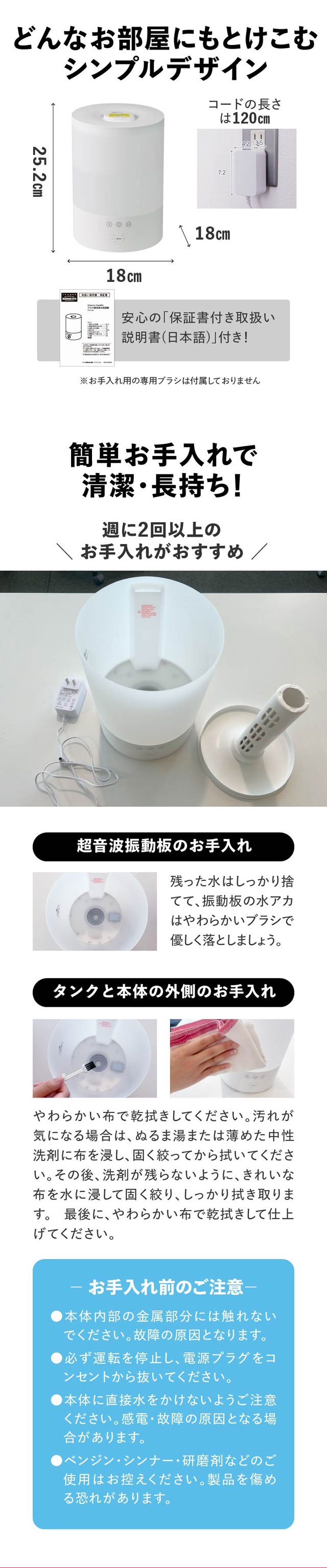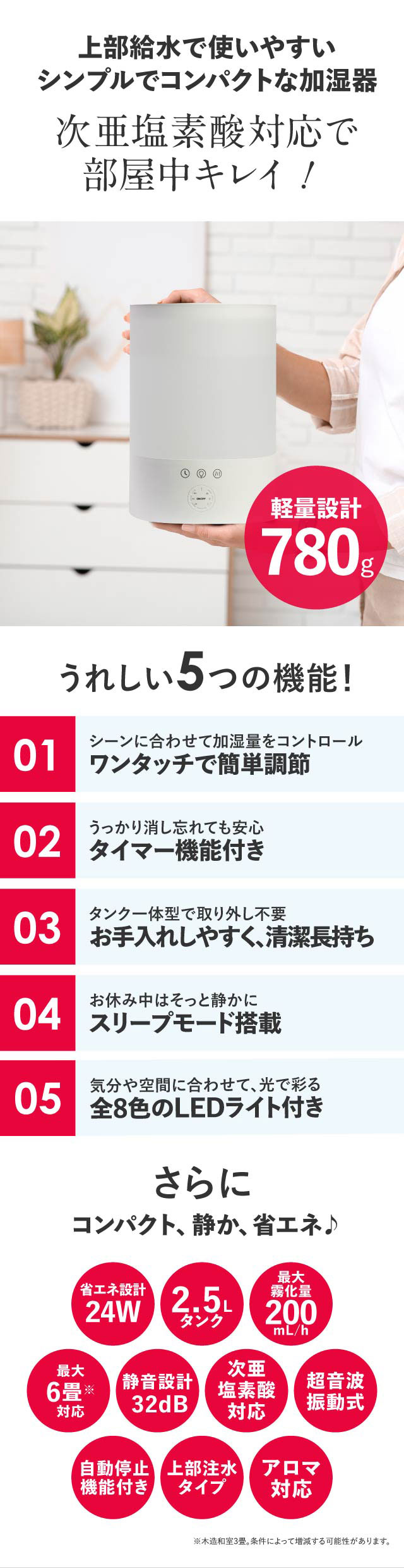 | 特徴 | 2.5Lタイプの超音波式加湿器(噴霧器)です。上部給水タイプの為、水の補給が簡単に出来ます。添付の取扱説明書には次亜塩素酸水対応の記載はありませんが、メーカー及び、50ppm以下の次亜塩素酸水への動作は確認済みです。本製品は1年間の品質保障付き。 ●電気代は1時間あたり約0.74円の省エネ設計(消費電力24W) ●使いやすいタッチパネル式。電源・ミスト量・タイマー・ライト機能を個別ボタンで簡単に切り替え可能。 ●運転モードは「弱・中・強」の3段階、最大加湿量200ml/h ●2・4・8時間のタイマー設定付き ●ライトは全8色の単色モードとグラデーション点灯の切替が可能 ●空焚き防止機能付き ●スリープモード搭載 |