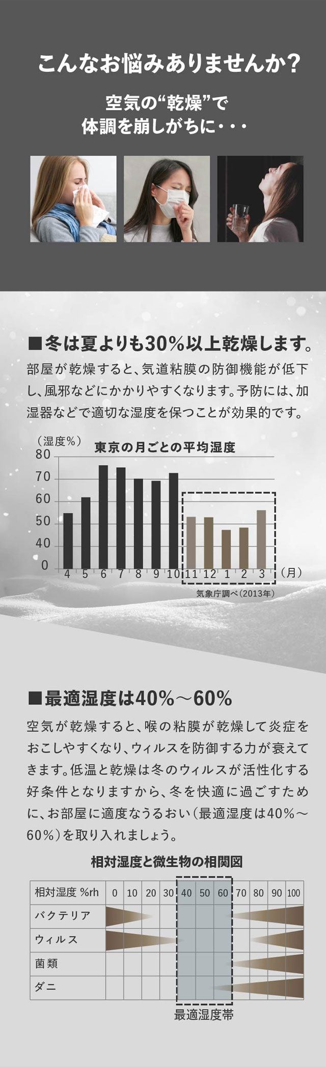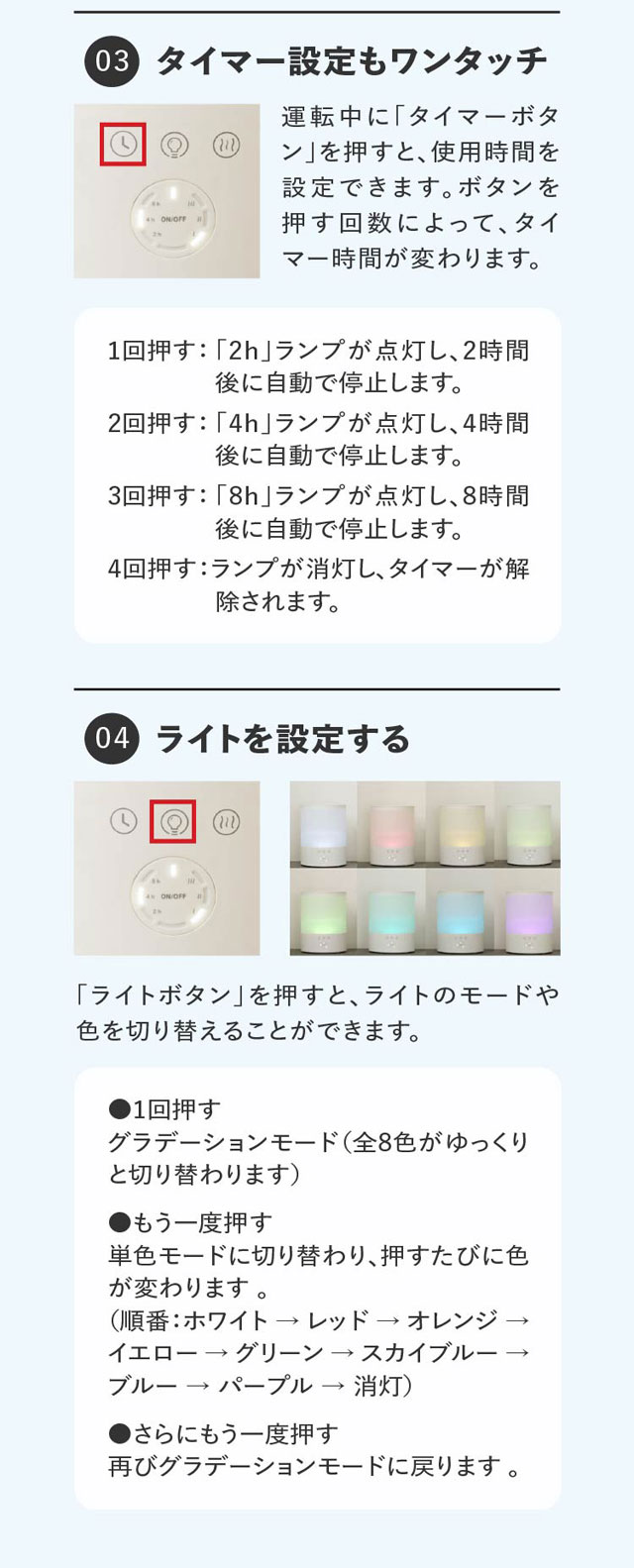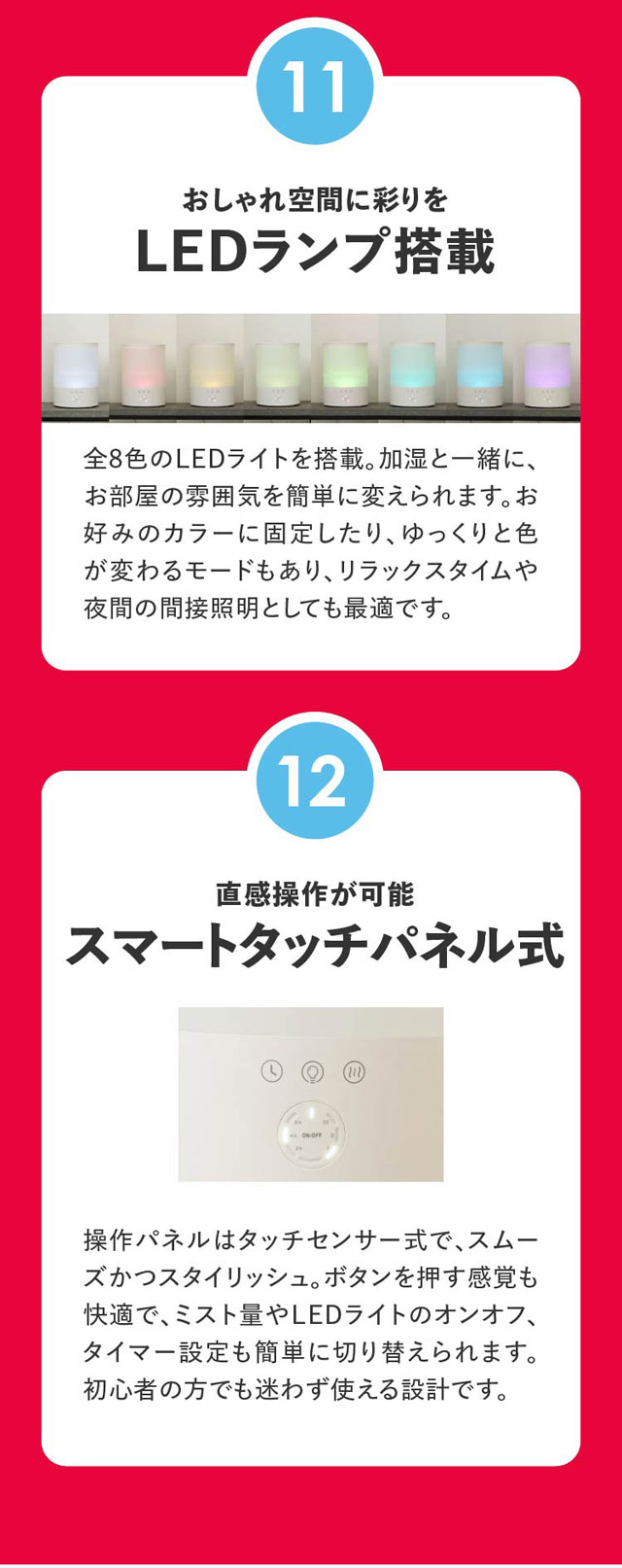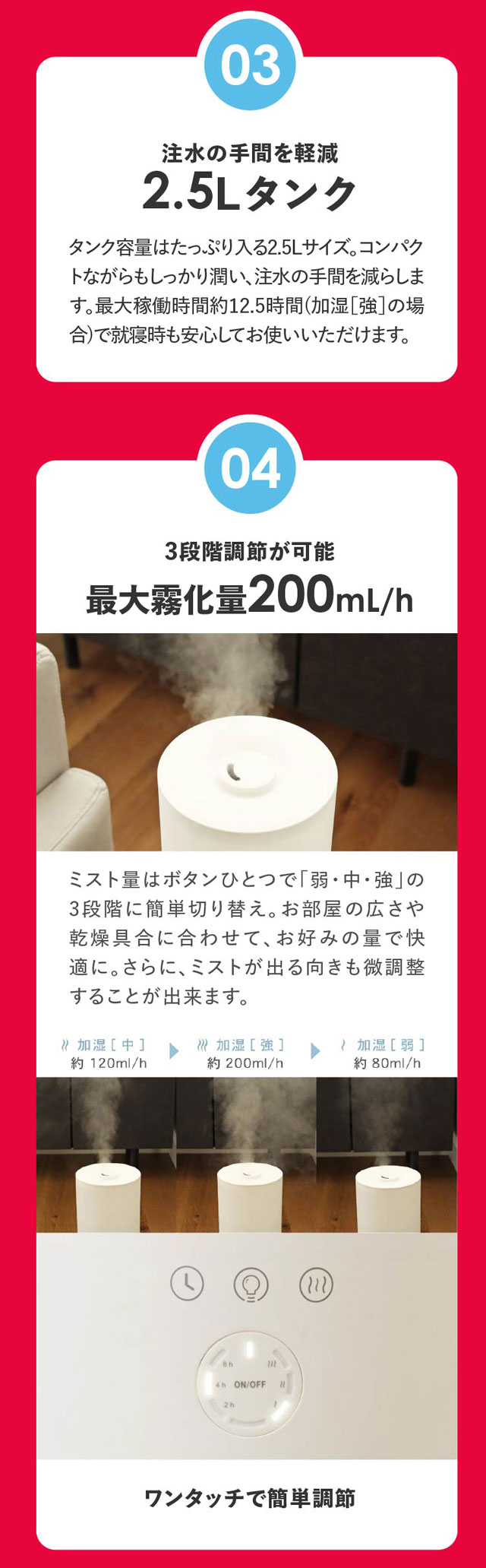 | 霧化量 | 加湿量は約80ml/h、120ml/h、200ml/hの3段階に調節可能。お部屋の湿度やお好みに合わせて簡単に加湿量を調整できます。さらに、ミストの吹き出し方向も微調整が可能です。 ※噴霧量に若干の個体差はございます。その為、ミストの見え方にも個体差がでます。使用環境、室内温度、湿度、水の温度などによっても噴霧量の違いがでます。 |